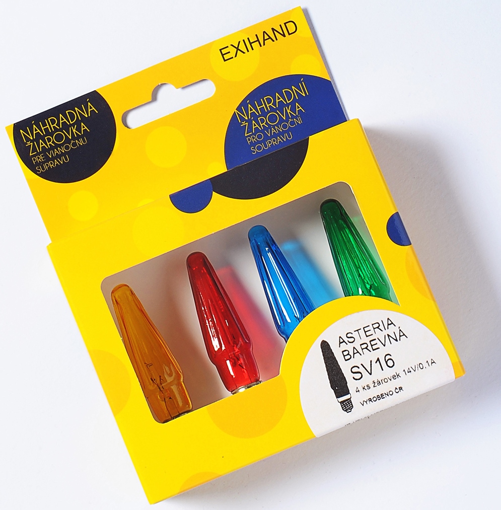 Tradiční skleněná žárovka ruční výroby1 blistr = 4 žárovky, mix všech barev (modrá, červená, zelená, žlutá)
